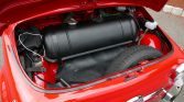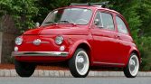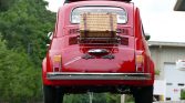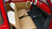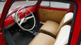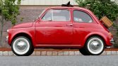 This 1967 Fiat 500F was refurbished and modified during prior ownership, with work including refinishing the exterior in red, reupholstering the two-tone seats, and installation of a 600cc twin. Equipment includes a four-speed manual transaxle, a sliding cloth sunroof, vent windows, a parcel rack, and 12″ wheels.