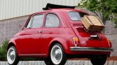 This example has been refinished in red, and exterior details include a black cloth sunroof, a chrome parcel rack with a wicker basket, chrome bumpers, “Nuova 500” badging,…