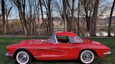 This 1961 Chevrolet Corvette convertible is finished in Roman Red over red vinyl, and it is powered by a numbers-matching 283ci V8 equipped with dual four-barrel carburetors and paired with a four-speed manual transmission. Factory features include a removable hardtop, a Wonderbar AM radio, a heater, and seat belts.