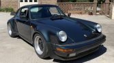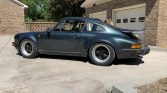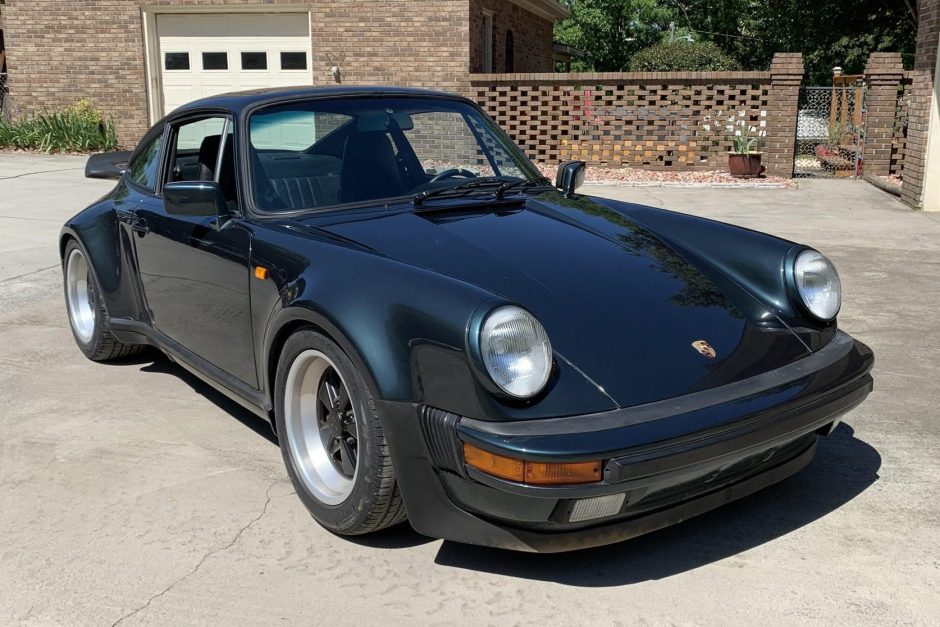 This 1984 Porsche 911 Carrera Coupe is finished in Moss Green Metallic over a black leather interior and is powered by a 3.2-liter flat-six paired with a five-speed manual transaxle. The body has been modified with wider fenders, and additional equipment includes 16″ Fuchs wheels, a sunroof, Bosch H4 headlights, fog lights, Bilstein shocks, 930 Turbo tie rod ends, SSI heat exchangers, black leather power-adjustable sport seats, a MOMO steering wheel, and a Sony head unit.