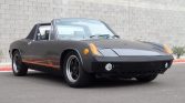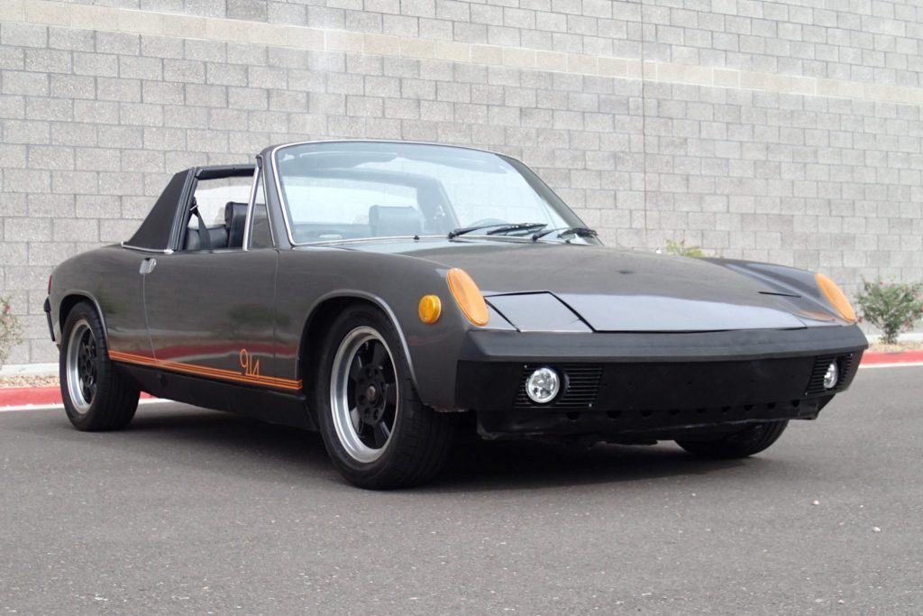 This 1972 Porsche 914 is finished in gray over two-tone gray and black vinyl upholstery and is powered by a replacement 2.0-liter flat-four paired with a replacement Type 901 side-shift five-speed manual transaxle. Features include dual Weber carburetors, an aftermarket exhaust system, a removable roof panel, retractable headlights, integrated fog lamps, and a Dino steering wheel.