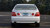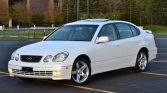 This 2000 Lexus GS400 is finished in Crystal White over Ivory Leather and powered by a 4.0-liter V8 paired with a five-speed automatic transmission. Equipment includes 17″ alloy wheels, steering-wheel-mounted shift controls, a power glass moonroof with a sunshade, HID headlamps, fog lamps, a body-colored spoiler with an integrated brake lamp, heated front seats and mirrors, dual-zone automatic climate control, a Nakamichi audio system, and an in-dash six-disc CD changer.
