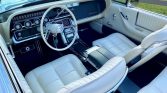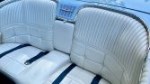 The car received a blue and white pearl vinyl interior with Selectaire air conditioning and a powered driver seat from the factory. The cabin was redone in 2008 with replacement seat foam, front and rear upholstery, carpeting, door panels, and rear trim panels. The floor of the car was stripped at that time and coated with a Lizard Skin liner before being further insulated with FatMat material. An AM/FM stereo with iPod connectivity has been mounted in the factory location, and the air-conditioning system has been converted to use R134a refrigerant.