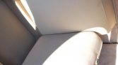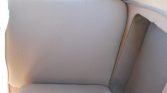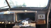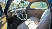 The seats are finished in tan cloth with matching door panels and carpets. Lap belts have been added, and an analog clock and an AM radio are fitted in the dash. A set of fold-down “opera” seats are positioned behind the front split-bench. Noted issues include stains on the passenger side rear seat and headliner, wear on the dash and gauges, and a missing heater knob.