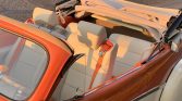 The car is said to have been converted from a 2-door sedan to a convertible and repainted in ivory and orange during the refurbishment. Features include a VW Super Beetle-sourced convertible soft top with modified bows and quarter windows, a chrome spotlight and bumpers, custom-built stainless center hood trim, and 1956 Bel-Air fender and quarter panel trim, rear fender skirts, stone guards, and dual-outlet exhaust.