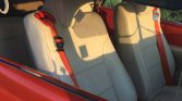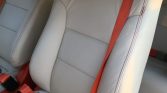The cabin features ivory leather upholstery joined by a matching dashboard, door panel accents, and headliner along with contrasting orange seat belts and taupe carpets. Features include power windows, Vintage Air climate control, electronic opening doors, Honda-sourced front seats with shoulder belts, rear window blinds, tinted sun visors, and a Pioneer CD stereo.