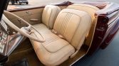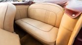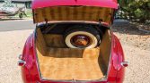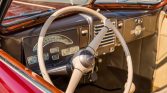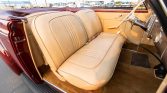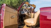 The car rides on a 116″ wheelbase and is finished in maroon with tan pinstripes and polished moldings on the sides. Equipment includes a tan Haartz cloth top with glass rear window, a two-piece windshield with a center mounted antenna, running boards, windshield wipers, and chrome bumpers. A body-colored top boot accompanies the vehicle.
