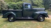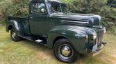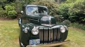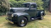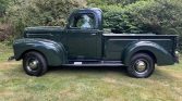 This 1946 Ford Pickup is finished in dark green over brown vinyl and powered by 302ci V8 paired with a three-speed automatic transmission. Equipment includes a bench seat, a wood bed floor, dual taillights, and running boards.
