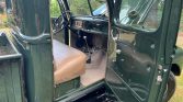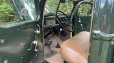 The bench seat is upholstered in brown vinyl, and tan carpets line the floors. The truck battery has been relocated from the engine bay to underneath the bench seat along with a master battery shutoff switch.