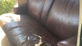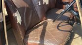 The interior features brown leather upholstery on the seating surfaces, which are torn and showing other signs of age. Features include a sliding sunroof, “quick-lift” windows, and a dual-band Radiomobile radio mounted under the dashboard. The heater valve was repaired under current ownership.