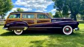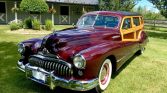 This 1947 Buick Roadmaster Estate is one of 300 wood-paneled station wagon examples produced for the model year and was refurbished under previous ownership. It is powered by a 320ci Fireball straight-eight paired with a three-speed manual transmission. The car is finished in Royal Maroon Metallic with a black vinyl roof, and features include maple and mahogany wood paneling, leather and cloth upholstery, an electric fuel pump, and a period radio.