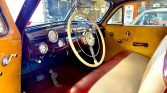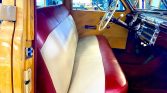 The cabin houses two rows of bench seating upholstered in Bedford cloth accented in red leather, while the doors, side panels, and ceiling slats are comprised of wood trim. Controls for the heater and defroster are housed in the center of the dashboard, which also features a Buick push-button radio modified to receive both AM and FM frequencies. An analog clock is positioned ahead of the front passenger.