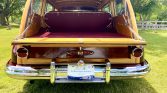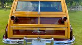 The Hercules-built body was refinished in Royal Maroon Metallic under previous ownership and is trimmed in wood paneling with a roof covered in textured vinyl. The seller notes that the blonde maple and ribbon stripe dark mahogany wood elements were replaced during the refurbishment. Additional features include chrome side trim, rear fender skirts, and a split rear tailgate.