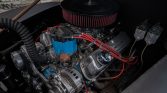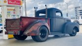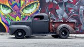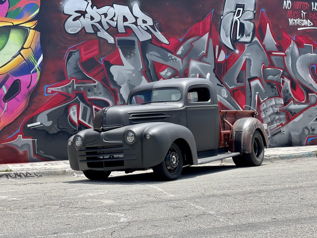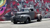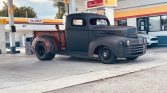 This 1947 Ford pickup is from a 302ci Ford V8 that drives the rear wheels through a three-speed automatic transmission. Additional modifications include a mock dually rear end, widened rear fenders, a 1947 Ford coupe front grille, rear-hinged doors, four-wheel disc brakes, power steering, front coilovers, a custom exhaust system with vertical stacks, LED exterior lighting, and AutoMeter Antique Beige gauges.