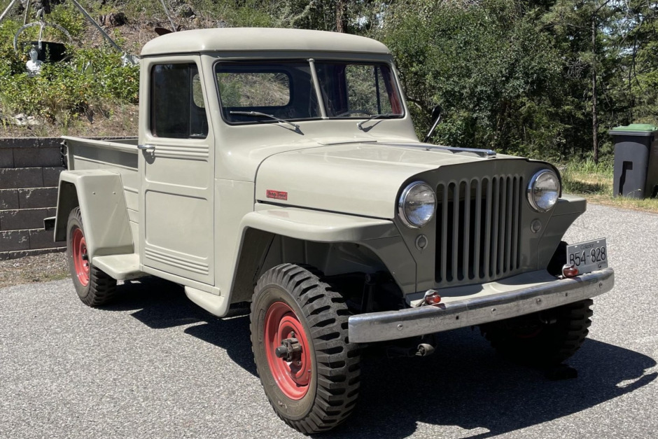 This 1948 Willys-Overland Jeep Model 4T pickup was purchased by the seller’s father in Kelowna, British Columbia, in 1948, and it was refurbished between 1999 and 2002 after the seller took possession of the truck. It was refinished in gray, and additional refurbishment work included rebuilding the 134ci inline-four, refreshing the interior with dark red vinyl upholstery, replacing the windshield and seals, and rebuilding the carburetor, radiator, front hubs, generator, and starter. Equipment includes a three-speed manual transmission paired with a Spicer transfer case, a chrome front bumper, red-finished 16″ steel wheels, and a cabin heater.