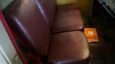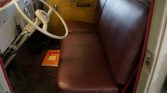 The cabin features body-color sheet metal along with a reupholstered dark red vinyl bench seat, headliner, and sun visors. A replacement dark red rubber mat lines the floor, and equipment includes manual-crank windows, a glovebox, and a cabin heater.