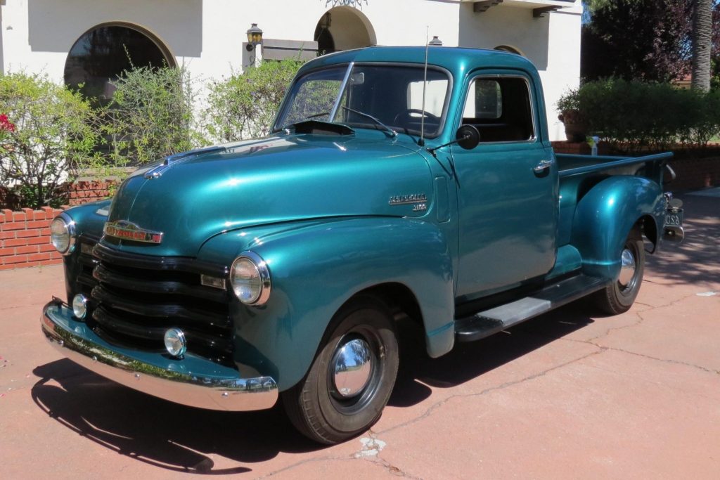This 1949 Chevrolet 3100 is a half-ton pickup that is finished in green over brown vinyl and powered by a 235ci inline-six paired with a three-speed manual transmission. The truck was refurbished during previous ownership with work including a body-off repaint, seat reupholstery, and rebuilding the engine. The seller acquired the truck in 2020, and features consist of dual side mirrors, a wooden bed floor, 15″ steel wheels, an AM radio, a heater, and a spare tire carrier beneath the bed.