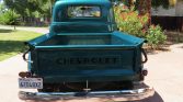 Black steel 15″ wheels feature silver hubcaps embossed with the Chevrolet logo and are fitted with 6.70″ American Classics tires. A spare wheel and tire are mounted beneath the bed.