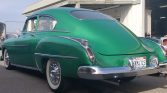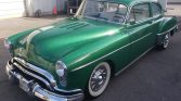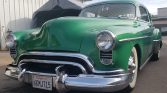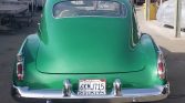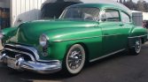 The bodywork was repainted in the current Glade Green shade during previous ownership in the 1980s, and the emblems have been shaved from the hood and trunk. Custom louvers have been added to the hood, a later-style one-piece windshield is fitted, and trim components from a 1950 Oldsmobile replace the factory components.