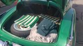 Red-painted steel wheels wear Cadillac hubcaps with bullet-style centers and 15″ wide whitewall tires. A full-size spare featuring a matching tire is fitted in the trunk.