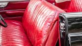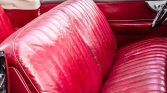 The red-painted steel wheels wear full chrome covers and are mounted with 8.20-15 BFGoodrich Silvertown bias-ply whitewall tires. A matching spare wheel and tire with a baby moon hubcap are mounted in the trunk. Stopping power is provided by hydraulic drums at all four corners.