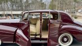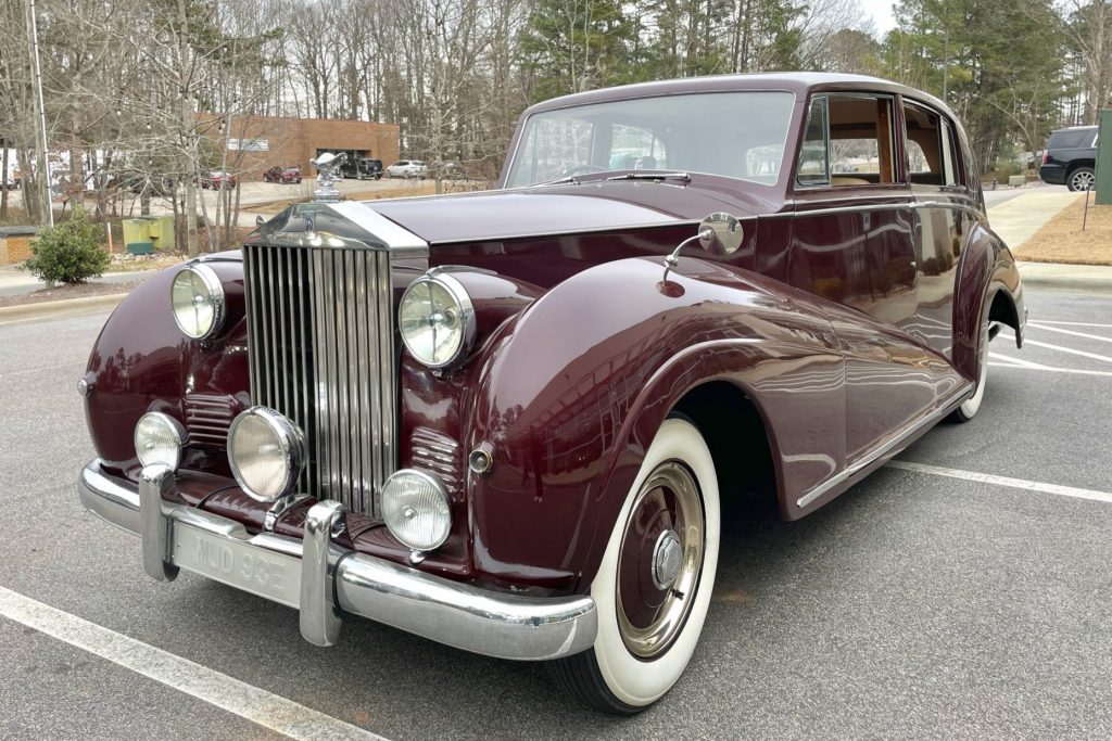 This 1951 Rolls-Royce Silver Wraith features sedan coachwork by James Young and is finished in dark red over beige leather. Power is supplied by a 4.6-liter F-head inline-six paired with a four-speed manual transmission, and features include a push-button radio, a front driving light and fog lamps, whitewall tires, and a chrome grill, trim, and bumpers.