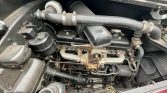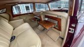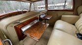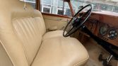 The right-hand drive cabin is trimmed in beige leather with matching door panels and carpets. Woodgrain accents are found throughout the interior, and amenities include a dash-mounted rear-view mirror, a push-button radio, and a retractable rear blind, as well as footrests, grab handles, and fold-away tray tables for the rear seat passengers.