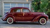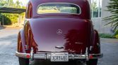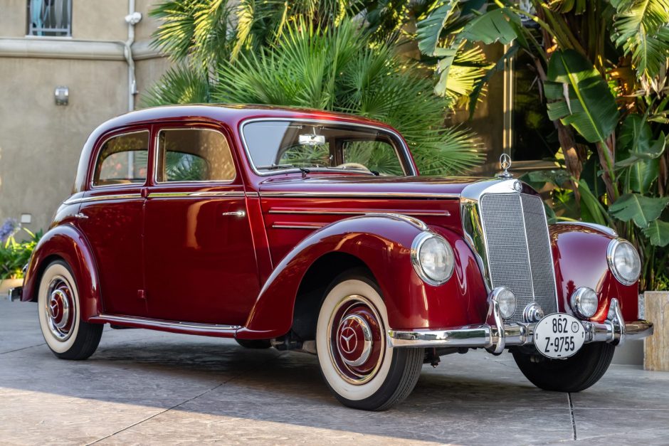 This 1953 Mercedes-Benz 220 sedan is powered by a 2.2-liter inline-six paired with a column-shifted four-speed manual transmission. It is finished in red over tan vinyl and equipped with 15″ steel wheels, a Becker radio, Hella driving lamps, trafficators, and chrome bumpers with overriders.