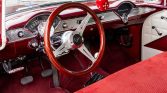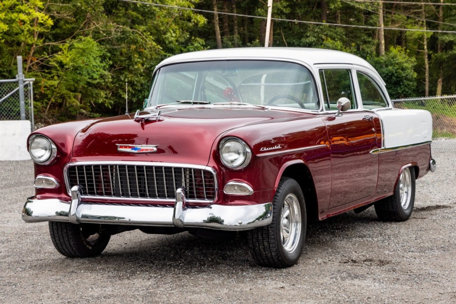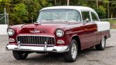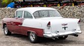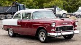 This 1955 Chevrolet 210 two-door sedan underwent a refurbishment that was completed in 2002 and is powered by a 402ci V8 linked with a Muncie M22 four-speed manual transmission. Equipment includes a COMP Cams camshaft, Hedman headers, an Edelbrock intake manifold, a Holley carburetor, and a Moser Engineering 12-bolt rear end with 4.11 gears. The body was refinished in maroon and white, and the bench seats were re-trimmed in red and white cloth. The car also has 15″ American Racing wheels, front disc brakes, and traction bars in addition to a Hurst shifter and a retro-style stereo linked to a trunk-mounted CD changer.