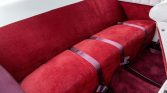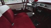 The cabin houses a split-back front bench and rear bench upholstered in red and white cloth. Interior appointments include a Hust shifter, a locking glovebox, and lap belts. A retro-style head unit is linked to a CD changer housed in the trunk.