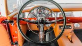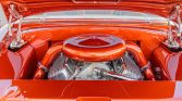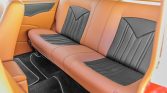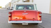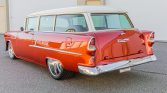 This 1955 Chevrolet 210 Handyman wagon is finished in metallic orange and white over an orange and black interior and powered by a 502ci V8 paired with a Turbo 400 three-speed automatic transmission. Features include a custom chassis by Scott’s Hot Rods, smoothed and wire-tucked engine bay, custom leather interior by Armando’s Auto Upholstery, adjustable coilovers at all four corners, Wilwood power-assisted four-wheel disc brakes, power steering, Budnik Muroc II wheels, a four-link rear suspension with a narrowed 9″ rear axle, Borla Pro XS mufflers, and a Kenwood CD/USB stereo.