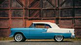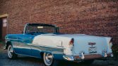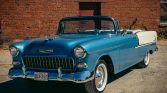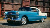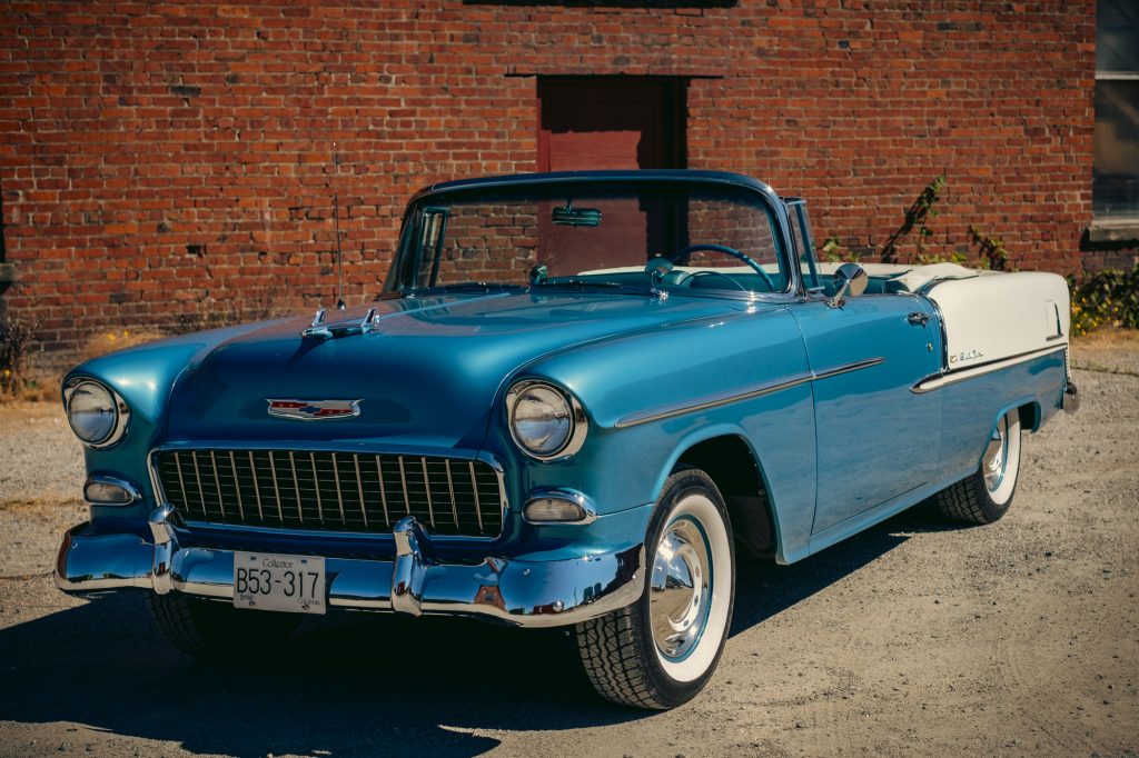 This 1955 Chevrolet Bel Air convertible is finished in two-tone blue and white with a white soft top over a blue interior, and its 265ci V8 is paired with a two-speed Powerglide automatic transmission. Equipment includes 15″ steel wheels with covers and whitewall tires, power brakes, power steering, an AM radio, a tissue dispenser, and a dash-mounted compass and traffic-light prism. The car was acquired out of Washington state with fire damage and was refurbished in British Columbia under previous ownership. Work is said to have included stripping the vehicle to bare metal, repairing the floor, replacing the rear quarter panels, refinishing the exterior, and redoing the interior. The current owner acquired the car in 2008 and has since added approximately 2,300 miles.