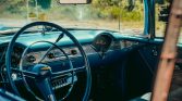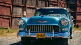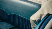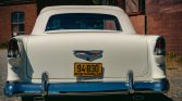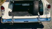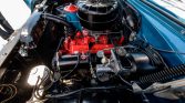 Blue-finished 15″ steel wheels wear Chevrolet-branded covers and are mounted with 215/75 BFGoodrich Silvertown whitewall radial tires. The car is equipped with power-assisted steering and power brakes.