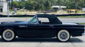 The refurbishment included a repaint in black, replating the chrome trim, and replacing the black soft top. Features include a hood scoop, Thunderbird badging, and exhaust outlets integrated into the rear overriders.