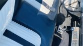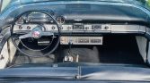 The cabin features a bench seat reupholstered in black vinyl with pleated white inserts as well as engine-turned dashboard and door panel accents. Equipment includes air conditioning, an analog clock, and an aftermarket Thunderbird stereo. A fire extinguisher is mounted in the trunk.