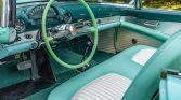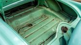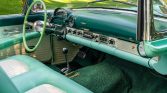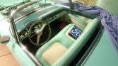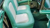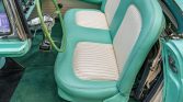 The bench seat is upholstered in turquoise vinyl with pleated white inserts, while stainless steel trim accents the matching dashboard and door panels. Amenities include a floor-mounted shifter, a heater, and electric windows.
