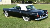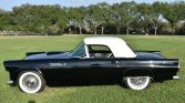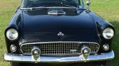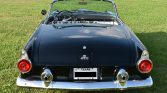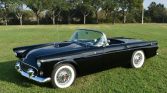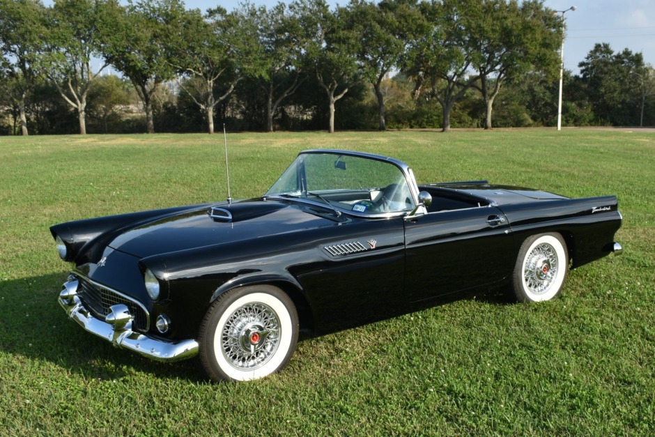 This 1955 Ford Thunderbird is finished in Black Raven over tuxedo vinyl and powered by a 292ci Y-block V8 paired with a three-speed Ford-O-Matic automatic transmission. Features include a white removable hardtop, 12-volt electric conversion, an emergency brake light indicator, chrome wire wheels, PerTronix electronic ignition, dual dashboard speakers, and a retro-style Bluetooth stereo.