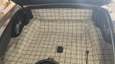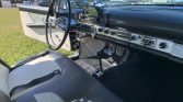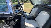 The cabin features a bench seat upholstered in black vinyl with pleated white inserts. Equipment includes a 12-volt electric conversion, heater and defroster, polished door sills, lap belts, dual dashboard speakers, a retro-style Bluetooth stereo, and engine-turned aluminum accents on the doors and dashboard. The the clock does not work, the power-seat motors were replaced but need to be wired in, and the heater control cables are not connected. A set of heater control cables are included in the sale. The seller notes that the carpet, floor heat shielding, seat foam, seat covers, heater box and motor, drop curtain, door panels, and kick panels have been replaced.