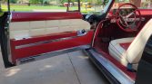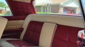 Both bench seats are trimmed in cream upholstery with red inserts and piping, and the side panels are finished to match. The car features a power-adjustable front seat, air conditioning, lap belts for the front occupants, floor mats, and power windows and door locks.