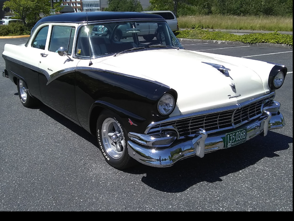 This 1956 Ford Fairlane Club Sedan is finished in black and white over a two-tone gray interior, and it is powered by an overbored 292ci V8 mated to a Borg-Warner five-speed manual transmission and a 3.25:1-geared rear axle. Modifications include American Racing Torq Thrust wheels, power brakes, power steering, a Hurst shifter, reupholstered front and rear bench seats, a Pioneer CD stereo with Clarion speakers, AutoMeter and Sunpro gauges, and a leather-wrapped Ididit steering wheel. The seller acquired the car in 2006 and subsequently integrated replacement engine components including Mummert aluminum heads and intake manifold, an Edelbrock AVS2 carburetor, an MSD distributor, and a Power Master starter.