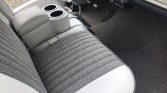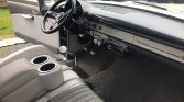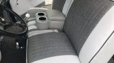 Originally trimmed in two-tone gray cloth, the cabin was reupholstered in its current shades of gray vinyl with darker gray inserts in 2015. Equipment includes front and rear bench seats with lap belts, a body-color dashboard, a heater, a push-button AM radio, an aftermarket Pioneer CD stereo, Clarion speakers, and a Hurst shifter with a white knob.