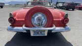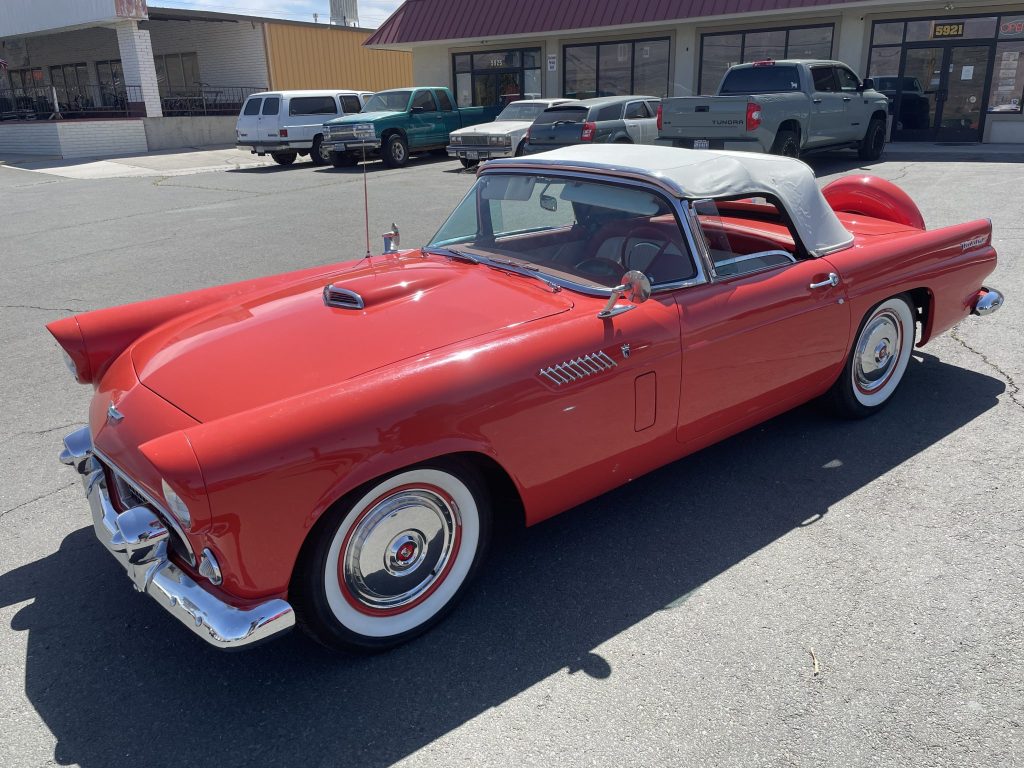 This 1956 Ford Thunderbird was acquired by the seller in 1997 and has been refinished in red over a two-tone red and white interior. Power comes from a 312ci V8 paired with a three-speed automatic transmission, and other equipment includes a white soft top, a Continental kit, steel wheels with covers, engine-turned interior trim, a tachometer, and a digital cassette stereo. The car was stored for a period of time, after which the seller had the carburetor rebuilt and the fuel tank and fuel lines replaced.