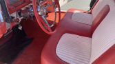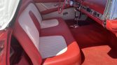 The interior features a bench seat with two-tone red and white upholstery, and the door panels maintain the color scheme. Engine-turned trim accents the dashboard as well as the door-panel inserts, while red carpeting covers the floors. A digital cassette player is mounted in the factory location.