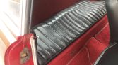 The cabin features front seats trimmed in black vinyl with red fabric inserts, matching two-tone door panels, and red carpets. An AM radio is installed, and flaws include stains on the carpet and a missing rearview mirror.