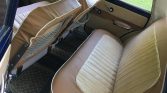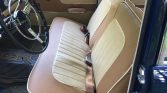 The foldable bench seats were recovered in brown and cream vinyl with white piping, and a replacement dash pad, door panels, and interior hardware were also fitted at that time. Features include a push-button radio, patterned floor mats, and lap belts for front occupants.
