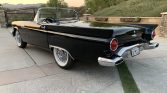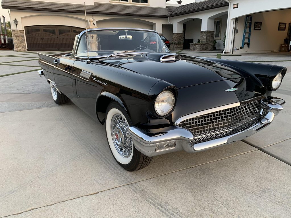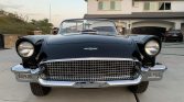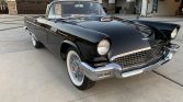 This 1957 Ford Thunderbird is finished in black over white and black and is powered by a 312ci V8 paired with a three-speed automatic transmission. Equipment includes a white fiberglass hardtop with porthole windows, air conditioning, an AM radio, and removable fender skirts.