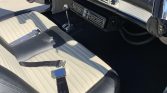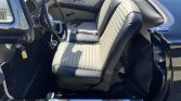 The interior features black vinyl seat upholstery with white pleated inserts, a matching dash pad and carpeting, and engine-turned aluminum trim on the dashboard and door panels. Equipment includes air conditioning, padded armrests and sun visors, lap belts, side vent windows, a heater/defroster, and an AM radio.