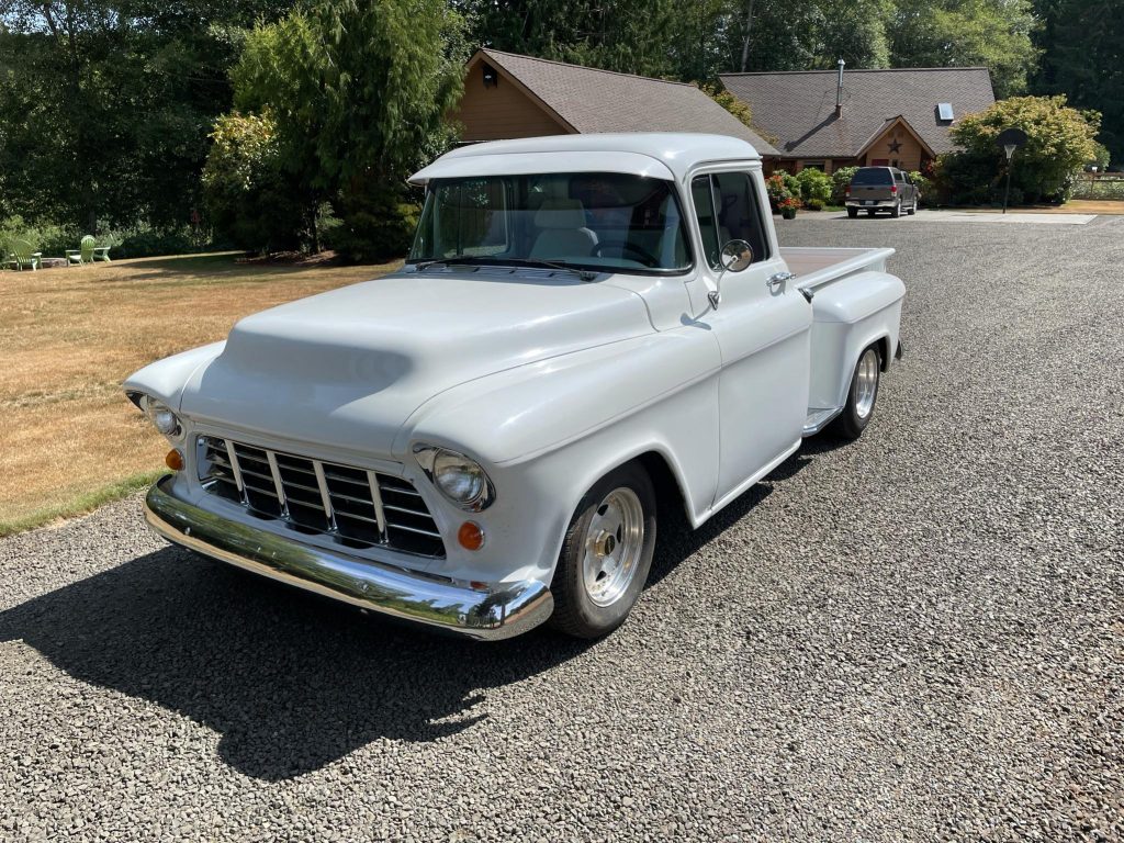 This 1957 GMC 100 pickup is finished in white over white and powered by a 350ci V8 mated to a three-speed automatic transmission. Features include oak bed slats, power-assisted front disc brakes, power steering, 15″ Prime alloy wheels, pinstriping, a chrome grille, trim, and bumpers, custom bucket seats, Classic Instruments gauges, a Blaupunkt AM/FM cassette stereo, an Edelbrock Performer intake manifold, HEI electronic ignition, a custom dual exhaust system, and a finned aluminum air cleaner and valve…