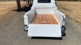 The truck is finished in white and features a step-side bed with oak bed flooring and stainless runners. Equipment includes a chrome grille, trim, and bumpers, a painted sun visor, dual exterior mirrors, and custom dual exhaust which exits below the rear bumper.