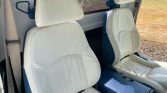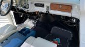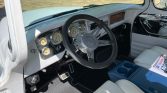 The cabin features seating upholstered in white leather with blue seat trim and a center console. Equipment includes a body-colored dash and door panels with chrome accents, air conditioning, blue carpets, seatbelts, aftermarket speakers, a Blaupunkt AM/FM cassette stereo, and a tilt steering column.